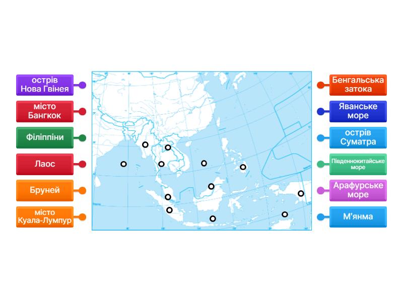 М'янма, Лаос, Бруней, Філіппіни, Арафурське море, Яванське море, Південнокитайське море, Бенгальська затока, острів Нова Гвінея, острів Суматра, місто Бангкок, місто Куала-Лумпур.