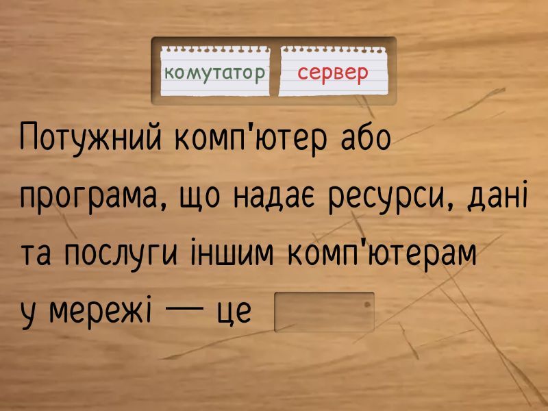 Потужний комп'ютер або програма, що надає ресурси, дані та послуги іншим комп'ютерам у мережі — це ____ ____ — це право на використання деякого ресурсу. Комп'ютер у мережі, що використовує ресурси сервера — це ____ ____ призначений для з’єднання кількох вузлів комп’ютерної мережі та забезпечення системи доступу до неї.