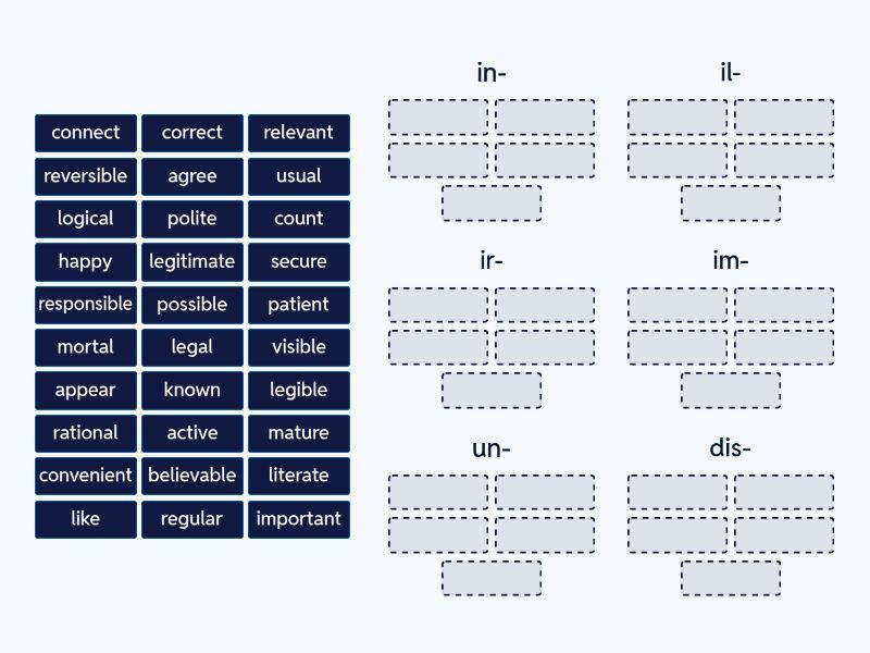 in-: correct, convenient, secure, visible, active, il-: legal, logical, legitimate, literate, legible, ir-: regular, responsible, rational, relevant, reversible, im-: possible, patient, mature, polite, mortal, un- : happy, believable, important, known, usual, dis-: agree, appear, count, like, connect,