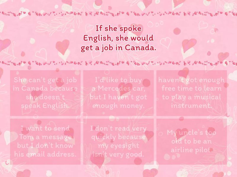 She can’t get a job in Canada because she doesn’t speak English. - If she spoke English, she would get a job in Canada., haven’t got enough free time to learn to play a musical instrument. - If I had enough free time, I’d learn to play a musical instrument., I want to send Tom a message but I don’t know his email address. - If I knew Tom’s email address, I’d send him a message., My uncle’s too old to be an airline pilot. - If my uncle were younger, he could be an airline pilot., I don’t read very quickly because my eyesight isn’t very good. - If my eyesight were better, I’d read more quickly., I’d like to buy a Mercedes car, but I haven’t got enough money. - If I had enough money, I’d buy a Mercedes.,