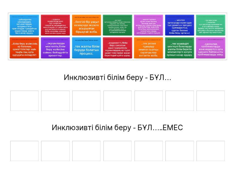 Инклюзивті білім беру - БҰЛ…: ... мектепті игілікті ортаға және барлық балалар үшін қол жетімді оқу орнына айналдыру үшін білім беру жүйесінің, білім беру мекемелерінің өзгеруі мен оларды жетілдірудің үздіксіз процесі., ...мәдениетті, білім беру саясатын және тәжірибесін оқушылардың әр түрлі қажеттіліктеріне жауап беретіндей қайта қарау., ...білім беру жүйесінің әр баланың қажеттіліктері үшін теңбе-тең орта құрудағы икемділігі, ... оқудағы кедергілерді жою; оқу процесіне, сондай-ақ академиялық және әлеуметтік табыстарға қол жеткізуге атсалысу. Әрбір жағдайды жекеше және өзгеше қарастыру., ...қабылданған шешімдерден, қатынастардан, қолданыстағы практикадан туындайтын кедергілерді жоюға баса назар аудару., ...әр түрлі қатысушылардың (педагогикалық кадрлар, ата-аналар, қоғам мүшелері, жергілікті көшбасшылар, үкіметтік емес ұйымдар және т. б.) ынтымақтастығына негізделген процесс., ... мектеп ортасында және одан тыс дамитын процесс (қоғамдастық құрған балама білім беру ортасы)., Инклюзивті білім беру - БҰЛ…..ЕМЕС: ...белгілі бір уақыт кезеңінде жүзеге асырылған бірыңғай жоба., ...тек мүмкіндігі шектеулі балаларды жалпы білім беретін мекемелерге қосуға ерекше назар аудару., ...оқушыларды мектептің білім беру жүйесіне сәйкес бейімдейтін әрекеттер., ...тек мектепке / сыныпқа қол жеткізуді қамтамасыз етуге ерекше назар аудару; кез-келген жағдайда қолдануға болатын ережелер мен әрекеттер жиынтығы., ..қаржылық проблемаларды және кедергісіз орта құрумен байланысты проблемаларды жеңу., ...тек ресми тұлғалар немесе сыртқы сарапшылар енгізетін жоба., ..тек жалпы білім беруде болатын процесс.,