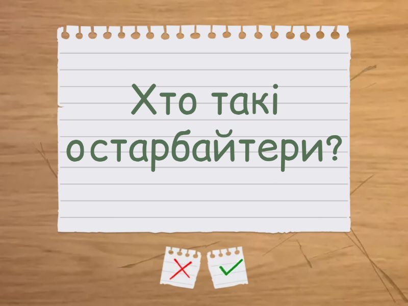 Що означав для України «новий порядок»? - Система окупаційного терору, грабунку та знищення населення., Назви два місця масових розстрілів мирних жителів під час окупації. - Бабин Яр у Києві, Дробицький Яр у Харкові., Хто такі остарбайтери? - Примусово вивезені на роботи до Німеччини мешканці окупованих територій., Яка організація створила УПА? - Організація українських націоналістів (ОУН) під проводом Степана Бандери., Які завдання спершу виконувала УПА? - Самооборона населення від грабунків, насильства, облав і депортацій., У чому відмінність УПА від радянських партизанів? - УПА воювала за незалежну Україну, а радянські партизани — за відновлення влади СРСР., Що стало причиною Волинської трагедії? - Конфлікт між українським і польським підпіллям, загострений німецькими та радянськими провокаціями., Що об’єднувало всі течії Руху Опору в Україні? - Бажання свободи й визволення від окупантів.,