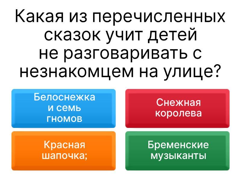 1) Какая из перечисленных сказок учит детей не разговаривать с незнакомцем на улице? a) Белоснежка и семь гномов b) Снежная королева c) Красная шапочка; d) Бременские музыканты 2) О какой чрезвычайной ситуации рассказывает стихотворение С. Я. Маршака «Кошкин дом»? a) наводнение b) пожар c) ураган d) землетрясение 3) Где нельзя кататься на велосипеде? a) в детском парке b) на детской площадке c) на проезжей части d) на велодорожке стадиона 4) Какая из представленных сказок учит детей не открывать дверь незнакомым? a) Спящая красавица b) Колобок c) Пузырь, соломинка и лапоть d) Волк и семеро козлят 5) Находясь дома, вы почувствовали запах горящей проводки. Что надо делать в первую очередь? a) приступить к ее тушению водой, песком b) обесточить электропроводку в квартире c) включить свет, чтобы лучше рассмотреть место возгорания d) открыть окно 6) В доме возник пожар. Можно ли воспользоваться лифтом, покидая дом? a) ни в коем случае нельзя b) можно, чтобы быстрее покинуть дом c) можно, если лифт остановился на вашем этаже d) можно, спрятаться в лифте 7) Как нужно передвигаться, покидая сильно задымленное помещение? a) пригнувшись b) ползком, держа голову ближе к полу c) на коленках d) в полный рост 8) Если тебя угощает конфеткой незнакомый человек на улице, что ты будешь делать? a) скажешь спасибо b) возьмешь и убежишь c) откажешься от угощения d) возьмешь и быстро съешь 9) Какой номер телефона нужно набрать, если начался пожар a) 101 b) 103 c) 104 d) 102 10) Ты дома один. В дверь кто-то постучался и попросил впустить. Что ты будешь делать?  a) открою дверь b) Впущу c) Впущу, только если скажут, что это полиция d) Никого не впущу, позвоню родителям