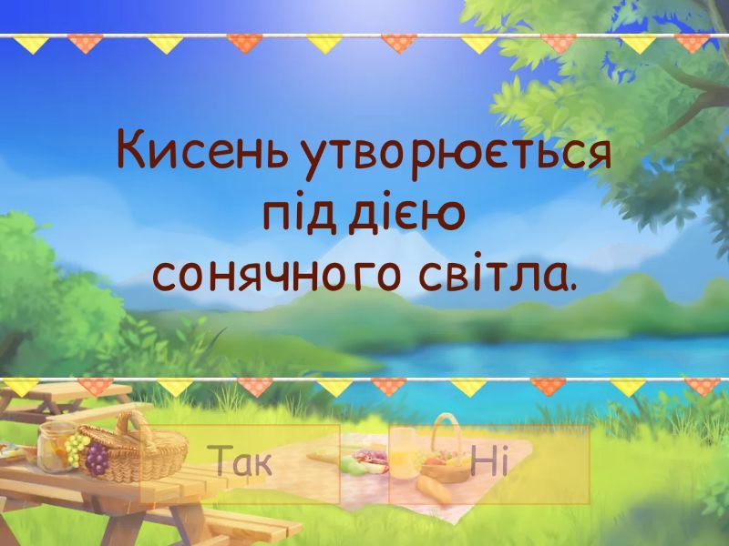 Так: Кисень утворюється під дією сонячного світла., Рослини вдень виділяють кисень у процесі фотосинтезу., У процесі горіння кисень витрачається., Дихання і фотосинтез — взаємопов’язані процеси., Гниття органічних решток — процес, під час якого витрачається кисень., Під час дихання рослини і тварини виділяють вуглекислий газ., Колообіг кисню підтримує сталість складу повітря., Якщо зникнуть зелені рослини, колообіг кисню припиниться., Ні: Кисень витрачається лише під час дихання., Під час фотосинтезу кисень споживається., Колообіг кисню відбувається тільки в атмосфері., Основними джерелами утворення кисню є вулкани., Усі живі організми лише споживають кисень., Кисень не бере участі у горінні корисних копалин., Кисень — єдиний газ, який бере участь у процесі фотосинтезу.,