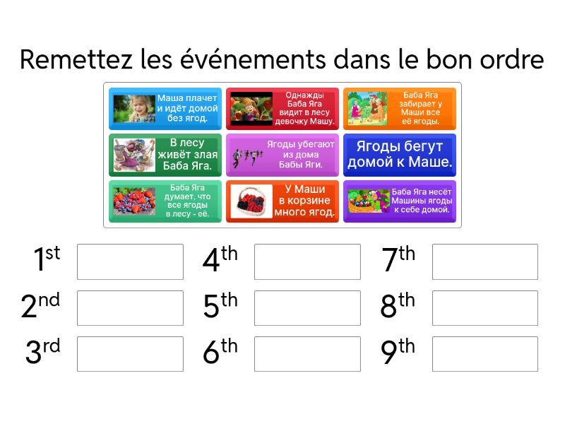 В лесу живёт злая Баба Яга., Баба Яга думает, что все ягоды в лесу - её., Однажды Баба Яга видит в лесу девочку Машу., У Маши в корзине много ягод., Баба Яга забирает у Маши все её ягоды., Маша плачет и идёт домой без ягод., Баба Яга несёт Машины ягоды к себе домой., Ягоды убегают из дома Бабы Яги., Ягоды бегут домой к Маше..