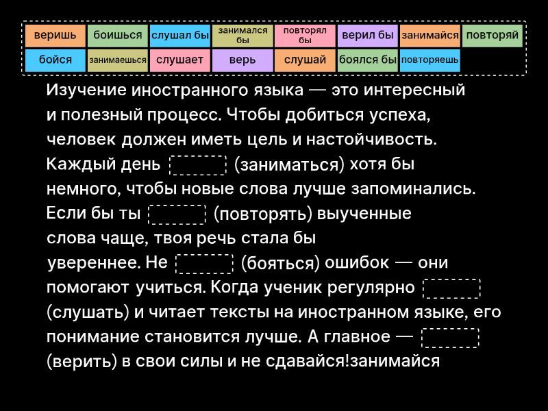 Изучение иностранного языка — это интересный и полезный процесс. Чтобы добиться успеха, человек должен иметь цель и настойчивость. Каждый день ____ (заниматься) хотя бы немного, чтобы новые слова лучше запоминались. Если бы ты ____ (повторять) выученные слова чаще, твоя речь стала бы увереннее. Не ____ (бояться) ошибок — они помогают учиться. Когда ученик регулярно ____ (слушать) и читает тексты на иностранном языке, его понимание становится лучше. А главное — ____ (верить) в свои силы и не сдавайся!занимайся