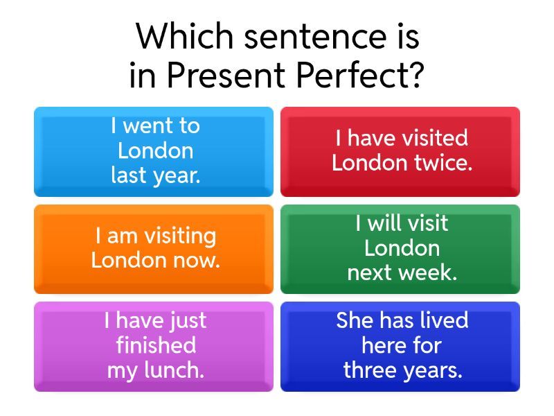 1) Which sentence is in Present Perfect? a) I went to London last year. b) I have visited London twice. c) I am visiting London now. d) I will visit London next week. e) I have just finished my lunch. f) She has lived here for three years. 2) Choose the correct sentence: a) She have finished her homework. b) She has finished her homework. 3) Which word is often used with the Present Perfect? a) yesterday b) ever 4) Choose the correct sentence: a) Did you ever been to Paris? b) Are you ever been to Paris? c) Have you ever went to Paris? d) Have you ever been to Paris? 5) Which sentence is NOT in Present Perfect? a) He has broken his arm. b) I have just eaten. c) We have lived here since 2010. d) We lived here since 2010.