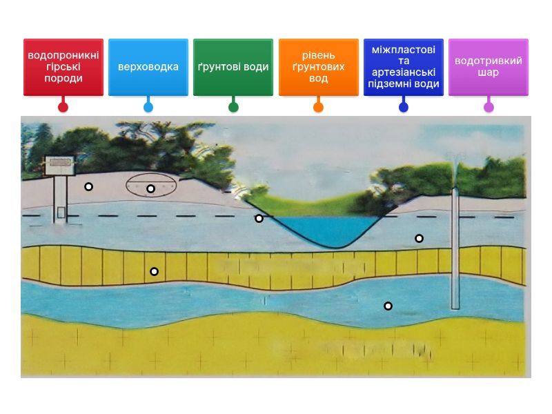 верховодка, водопроникні гірські породи, рівень ґрунтових вод, ґрунтові води, водотривкий шар, міжпластові та артезіанські підземні води.