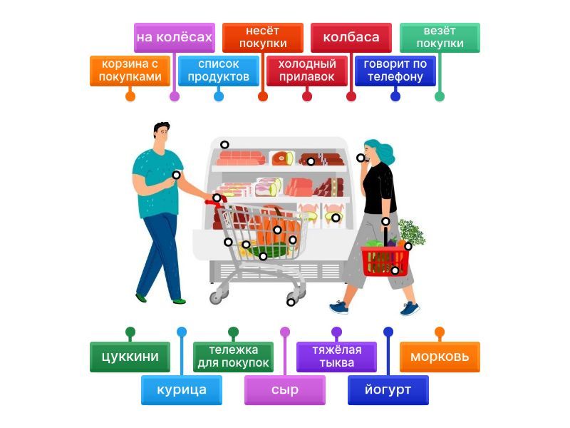 список продуктов, колбаса, корзина с покупками, тележка для покупок, на колёсах, говорит по телефону, везёт покупки, несёт покупки, тяжёлая тыква, курица, холодный прилавок, морковь, цуккини, сыр, йогурт.