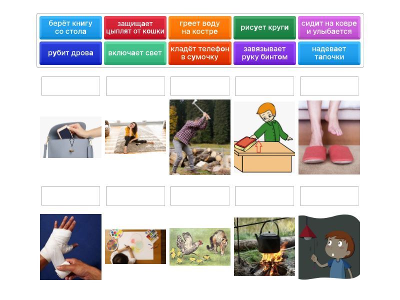 рисует круги, завязывает руку бинтом, греет воду на костре, рубит дрова, сидит на ковре и улыбается, включает свет, надевает тапочки, берёт книгу со стола, кладёт телефон в сумочку, защищает цыплят от кошки,