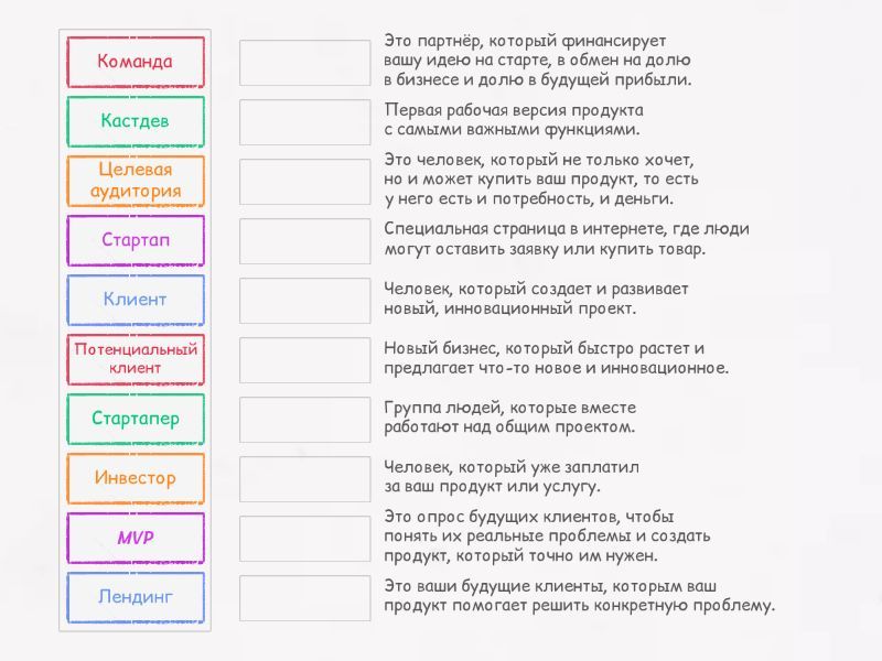 Лендинг - Специальная страница в интернете, где люди могут оставить заявку или купить товар., Стартап - Новый бизнес, который быстро растет и предлагает что-то новое и инновационное., Команда - Группа людей, которые вместе работают над общим проектом., MVP - Первая рабочая версия продукта с самыми важными функциями., Кастдев - Это опрос будущих клиентов, чтобы понять их реальные проблемы и создать продукт, который точно им нужен., Стартапер - Человек, который создает и развивает новый, инновационный проект., Целевая аудитория - Это ваши будущие клиенты, которым ваш продукт помогает решить конкретную проблему., Потенциальный клиент - Это человек, который не только хочет, но и может купить ваш продукт, то есть у него есть и потребность, и деньги., Клиент - Человек, который уже заплатил за ваш продукт или услугу., Инвестор - Это партнёр, который финансирует вашу идею на старте, в обмен на долю в бизнесе и долю в будущей прибыли.,