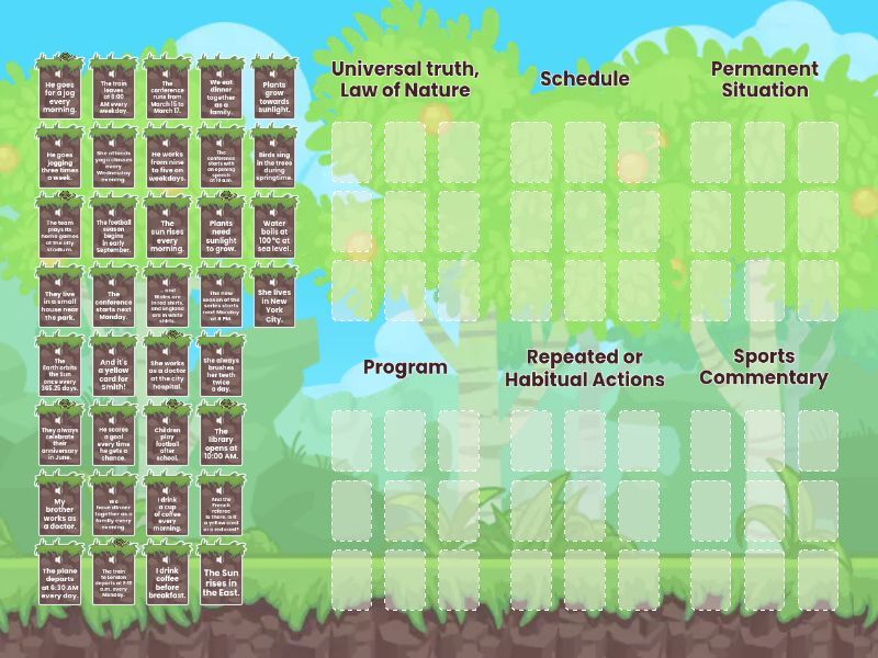 Universal truth, Law of Nature: The Sun rises in the East., The sun rises every morning., Plants need sunlight to grow., The Earth orbits the Sun once every 365.25 days. , Water boils at 100 °C at sea level., Schedule: The train leaves at 8:00 AM every weekday., The library opens at 10:00 AM., The train to London departs at 9:15 a.m. every Monday., He works from nine to five on weekdays., The plane departs at 6:30 AM every day., She attends yoga classes every Wednesday evening., Permanent Situation: She lives in New York City., My brother works as a doctor., She works as a doctor at the city hospital., They live in a small house near the park., Plants grow towards sunlight., We eat dinner together as a family., Program: The conference starts next Monday., The conference starts with an opening speech at 10 a.m., The football season begins in early September., The conference runs from March 15 to March 17., The new season of the series starts next Monday at 8 PM., Repeated or Habitual Actions: He goes for a jog every morning., They always celebrate their anniversary in June. , He goes jogging three times a week., I drink a cup of coffee every morning., We have dinner together as a family every evening., Birds sing in the trees during springtime., I drink coffee before breakfast., She always brushes her teeth twice a day., Children play football after school., Sports Commentary: The team plays its home games at the city stadium., He scores a goal every time he gets a chance., ... and Wales are in red shirts, and England are in white shirts., And it's a yellow card for Smith!, And the French referee is there. Is it a yellow card or a red card?,
