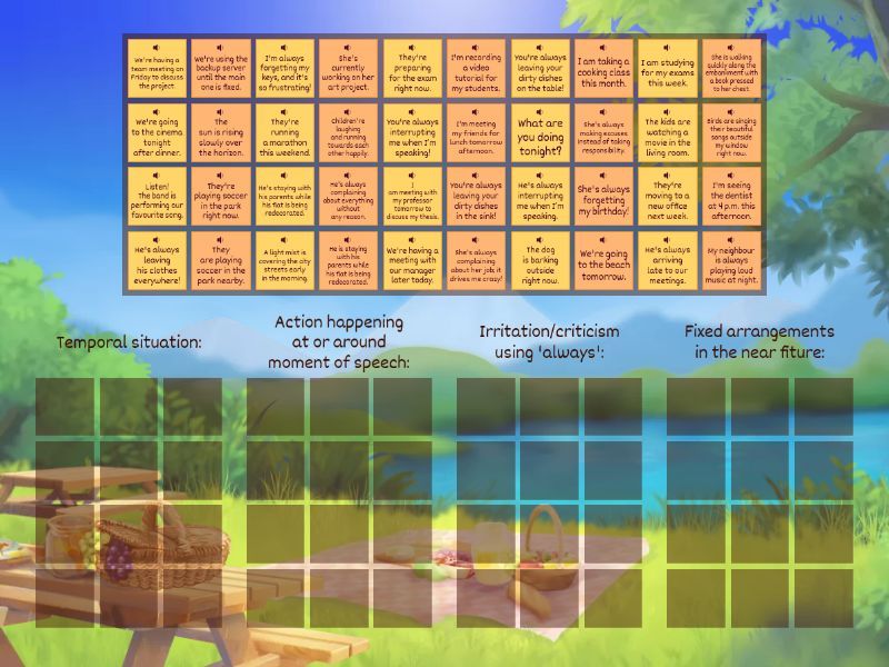 Temporal situation:: The sun is rising slowly over the horizon., A light mist is covering the city streets early in the morning., Birds are singing their beautiful songs outside my window right now., He is staying with his parents while his flat is being redecorated., I am studying for my exams this week., I am taking a cooking class this month., Action happening at or around moment of speech:: She's currently working on her art project., The dog is barking outside right now., They're playing soccer in the park right now., The kids are watching a movie in the living room., They're preparing for the exam right now., Listen! The band is performing our favourite song., I'm recording a video tutorial for my students., We're using the backup server until the main one is fixed., He's staying with his parents while his flat is being redecorated., She is walking quickly along the embankment with a book pressed to her chest., They are playing soccer in the park nearby., Children're laughing and running towards each other happily., Irritation/criticism using 'always':: He's always leaving his clothes everywhere!, She's always forgetting my birthday!, He's always interrupting me when I’m speaking., She's always making excuses instead of taking responsibility., He's always arriving late to our meetings., You're always leaving your dirty dishes in the sink!, She's always complaining about her job; it drives me crazy!, I'm always forgetting my keys, and it's so frustrating!, You're always interrupting me when I’m speaking!, My neighbour is always playing loud music at night., He's always complaining about everything without any reason., You're always leaving your dirty dishes on the table!, Fixed arrangements in the near fiture:: We're going to the beach tomorrow., They're running a marathon this weekend., We're having a meeting with our manager later today., I am meeting with my professor tomorrow to discuss my thesis., They're moving to a new office next week., I'm seeing the dentist at 4 p.m. this afternoon., We're having a team meeting on Friday to discuss the project., We're going to the cinema tonight after dinner., I'm meeting my friends for lunch tomorrow afternoon., What are you doing tonight?,