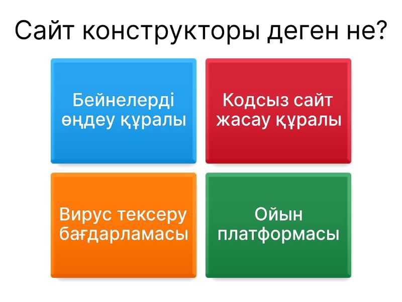 1) Сайт конструкторы деген не? a) Бейнелерді өңдеу құралы b) Кодсыз сайт жасау құралы c) Вирус тексеру бағдарламасы d) Ойын платформасы 2) Конструктордың басты артықшылығы қандай? a) Қиын код жазу b) Жылдам және оңай сайт жасау c) Тек программистер қолданады d) Тек офлайн жұмыс істейді 3) Сайт жасау үшін не қажет? a) Бос компьютер жады b) HTML бойынша терең білім c) Интернет және шаблон d) Фотоаппарат 4) “Drag-and-drop” қалай жұмыс істейді? a) Тек мәтін тереді b) Элементті сүйреп апарып қою c) Вирус жүктейді d) Компьютерді қайта іске қосады 5) Қайсысы сайт конструкторы? a) Tilda b) Photoshop c) Excel d) VLC Player 6) Конструкторда дизайн өзгерте аламыз ба? a) Иә b) Жоқ c) Тек бір мәрте d) Тек ақылыда 7) Онлайн дүкен жасауға бола ма? a) Иә b) Жоқ c) Тек программист жасайды d) Тек блог үшін 8) Домен қосу не үшін керек? a) Сайтқа атау беру үшін b) Видео жүктеу үшін c) Дыбыс өңдеу үшін d) Компьютерді жөндеу 9) Тегін нұсқа бар ма? a) Иә b) Жоқ c) Тек 1 сағатқа d) Тек премиумда 10) Дайын шаблон деген не? a) Алдын ала жасалған сайт үлгісі b) Компьютер драйвері c) Музыка қоймасы d) Кездейсоқ кодтар 11) Google Sites қай қызмет? a) Фото өңдеу b) Онлайн сайт құру құралы c) Хат жіберу d) Кесте жасау 12) Конструктор қашан тиімді? a) Сайтты тез жасау керек кезде b) Видеоны монтаждау қажет болғанда c) Бағдарлама орнатқанда d) Ойын жасағанда 13) Сурет қоюға болады ма? a) Иә b) Жоқ c) Тек кодпен d) Тек фон ретінде 14) Сайт құрылымын басқару нені білдіреді? a) Беттерді қосу/өшіру/өзгерту b) Компьютерді тазалау c) Интернетті өшіру d) Электр жүйесін басқару 15) Сайтты кейін өзгертуге бола ма? a) Иә b) Жоқ c) Тек бір рет d) Тек админ ғана