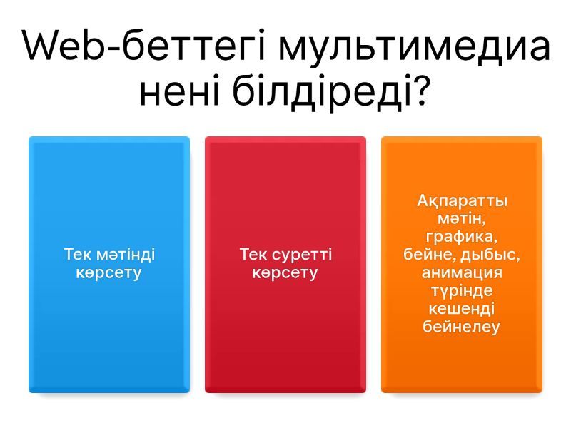 1) Web-беттегі мультимедиа нені білдіреді? a) Тек мәтінді көрсету b) Тек суретті көрсету c) Ақпаратты мәтін, графика, бейне, дыбыс, анимация түрінде кешенді бейнелеу 2) Мультимедиа элементтері пайдаланушыға қандай мүмкіндік береді? a) Тек оқу b) Экранмен еркін интерактивті түрде байланыс жасау c) Тек сурет қарау 3) Көрсетілген мәтін бойынша мультимедиа қайда қолданылады? a) Тек ойындарда b) Энциклопедиядан бастап мәліметтер базасына дейінгі жұмыстарда c) Тек мәтіндік құжаттарда 4) len() функциясының міндеті қандай? a) Жолды бөледі b) Жолдың ұзындығын анықтайды c) Жолдағы символды ауыстырады 5) Қай функция символдың нөмірлік кодын анықтайды? a) chr() b) ord() c) int() 6) Қай функция сандық код арқылы символ береді? a) ord() b) chr() c) float() 7) str() функциясы не істейді? a) Жолды бүтін санға айналдырады b) Жолда сандар бар-жоғын тексереді c) Сандарды жолға түрлендіреді 8) int() функциясы қандай мән береді? a) Нақты сан b) Бүтін сан c) Жол 9) Жолды жоғарғы регистрге түрлендіретін әдіс? a) lower() b) upper() c) split() 10) Жолдан жоластын бірінші кіруін табатын әдіс? a) rfind() b) find() c) replace() 11) Тек сандардан тұратынын тексеретін әдіс? a) split() b) isdigit() c) replace() 12) Мультимедиа құралдары дегеніміз не? a) Тек мәтін өңдеу құралдары b) Тек графикамен жұмыс істейтін құралдар c) Дыбыс, видео, мәтін, графика, анимация арқылы адам–компьютер байланысын қамтамасыз ететін құралдар 13) Web-сайт жобасында кем дегенде қанша бет болуы керек? a) 3 бет b) 5 бет c) 2 бет 14) Web-сайт беттерінде не болуы қажет? a) Тек мәтін b) Тек бейне c) Суреттер, кестелер, тізімдер 15) Сайт қандай құралдармен жасалуы керек? a) Word, Excel b) Photoshop c) FrontPage, HTML құралдары