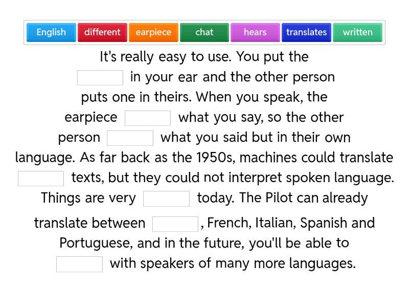 It's really easy to use. You put the ____ in your ear and the other person puts one in theirs. When you speak, the earpiece ____ what you say, so the other person ____ what you said but in their own language. As far back as the 1950s, machines could translate ____ texts, but they could not interpret spoken language. Things are very ____ today. The Pilot can already translate between ____, French, Italian, Spanish and Portuguese, and in the future, you'll be able to ____ with speakers of many more languages. What does this ____ for learning languages? Will ____ be able to travel without a dictionary or a guide? Will students be able to forget about ____? Will we be able to understand every language ____? Not yet, but one thing is clear; devices like the Pilot will be able to ____.