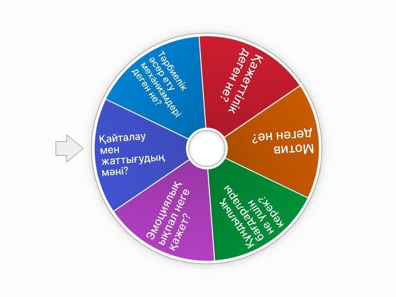 1) Тәрбиелік әсер ету механизмдері деген не? 2) Қажеттілік деген не? 3) Мотив деген не? 4) Құндылық бағдарлары не үшін керек? 5) Эмоциялық ықпал неге қажет? 6) Қайталау мен жаттығудың мәні?