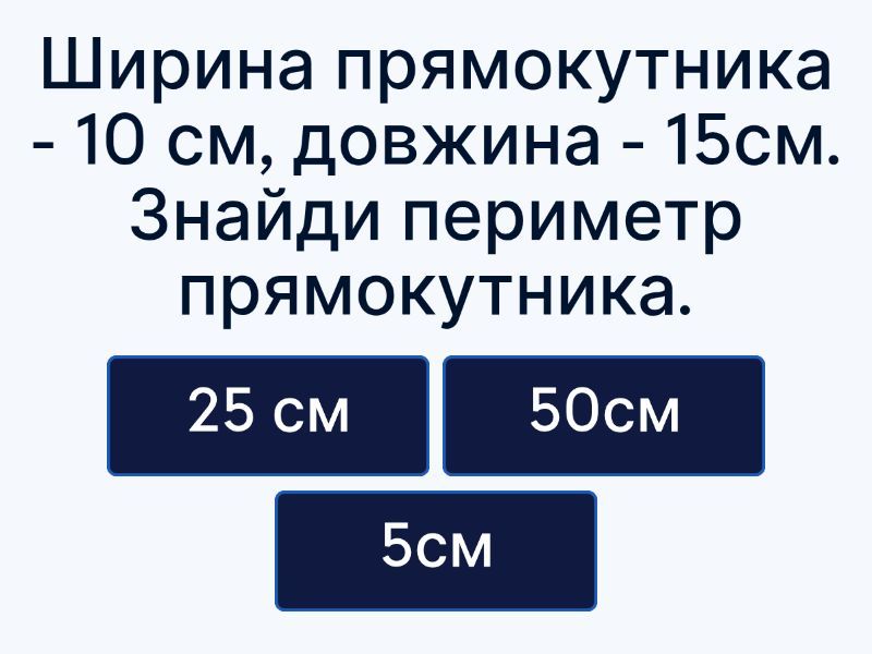 1) Ширина прямокутника - 10 см, довжина - 15см. Знайди периметр прямокутника. a) 25 см b) 50см c) 5см 2) Ширина прямокутника - 15м, довжина - 20м. Знайди периметр прямокутника. a) 70м² b) 35 c) 70м 3) Сторона трикутника - 10 см. Знайти периметр трикутника.  a) 30 см b) 300 см c) 20 см 4) Ширина прямокутника - 7м, довжина - 9м. Знайди площу прямокутника. a) 16м² b) 63м c) 63м² 5) Довжина прямокутника - 7 см, ширина - 10 см. Знайди площу прямокутника. a) 70 см b) 34 см c) 70 см² 6) Сторона квадрата - 6 см. Знайди площу квадрата. a) 24 см² b) 24 см c) 36 см² 7) Довжина прямокутника 8 км, площа 40 км². Знайди ширину прямокутника? a) 5 см b) 5 км c) 32 км 8) Ширина прямокутника 4 дм, площа 36 дм². Знайди довжину прямокутника? a) 9 дм b) 9 см c) 40 дм 9) Сторона квадрата 5 см. Знайди периметр квадрата. a) 25 см b) 10 см c) 20 см 10) Площа майданчика 30 м², а площа стадіону у 6 разів більша. Яка площа стадіону? a) 5 м² b) 180 м² c) 36 м² d) 180 м