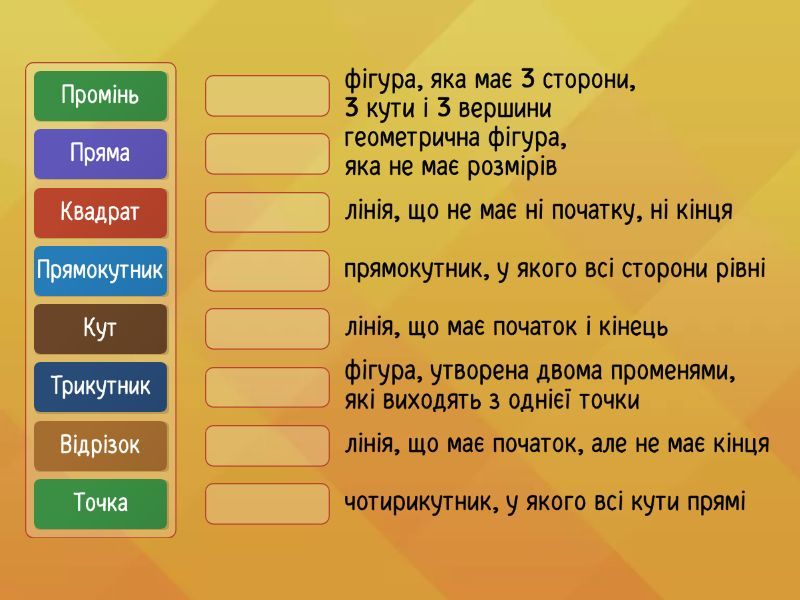 Точка - геометрична фігура, яка не має розмірів, Пряма - лінія, що не має ні початку, ні кінця, Промінь - лінія, що має початок, але не має кінця, Відрізок - лінія, що має початок і кінець, Кут - фігура, утворена двома променями, які виходять з однієї точки, Прямокутник - чотирикутник, у якого всі кути прямі, Квадрат - прямокутник, у якого всі сторони рівні, Трикутник - фігура, яка має 3 сторони, 3 кути і 3 вершини,