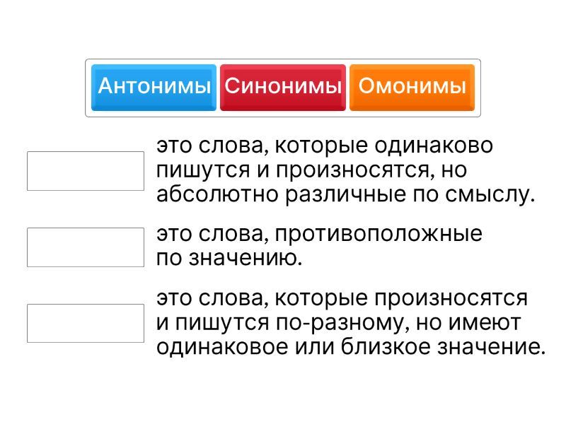 Антонимы - это слова, противоположные по значению., Омонимы - это слова, которые одинаково пишутся и произносятся, но абсолютно различные по смыслу., Синонимы - это слова, которые произносятся и пишутся по-разному, но имеют одинаковое или близкое значение.,