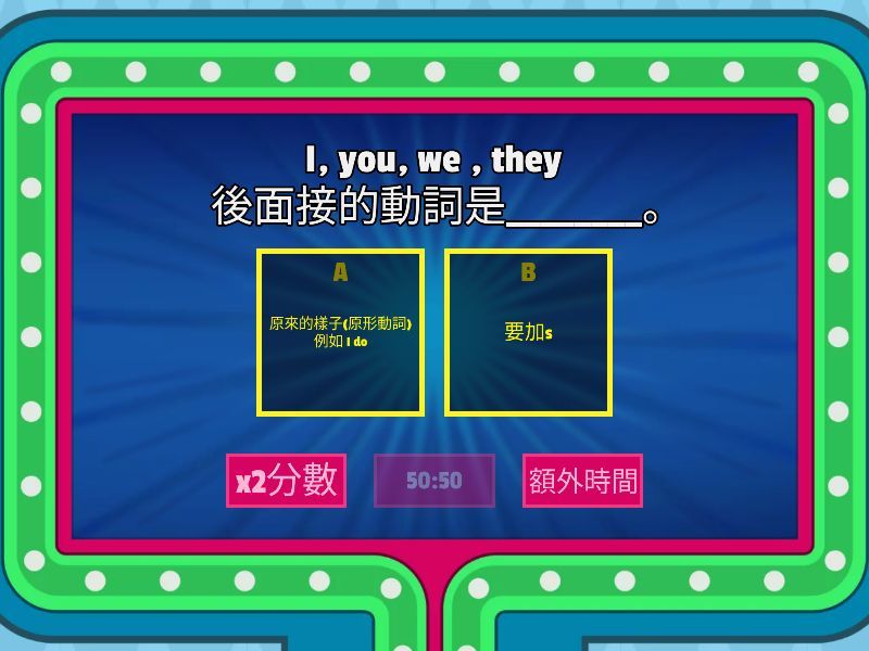 1) I, you, we , they 後面接的動詞是________。 a) 原來的樣子(原形動詞) 例如 I do b) 要加s 2) he, she, Boka,後面接的動詞是________。(第三人稱單數) a) 原來的樣子(原形動詞) b) 要加s, 例如 He does 3) I __________ at six thirty. a) get up b) gets up 4) She _________ to school at seven. a) go b) goes 5) Nina ________ breakfast at six. (Nina=She) a) have b) has 6) They ________ lunch at twelve. a) have b) has 7) Ana and Ben ________ their homework at five thirty. (Ana and Ben=They) a) do b) does 8) May _________ to bed at ten o'clock. (May=She) a) go b) goes 9) Joe _________ his homework at six forty. (Joe=He) a) do b) does 10) I ________ dinner at eight. a) have b) has 11) We __________ home at four thirty. a) go b) goes 12) She ________ at ten o'clock on the weekend. a) get up b) gets up 13) Mom and Dad _________ to work at nine o'clock. (Mom and Dad=They) a) go b) goes 14) Elsa _________ to bed at eleven o'clock. (Elsa=She) a) go b) goes 15) Your sister ___________ her homework at six fifty. (Your sister=你妹妹) a) do b) does 16) Your friends ___________ to school at seven forty. (你的朋友們) a) go b) goes 17) Your classmate _________ lunch at eleven o'clock. (classmate 同學-單數) a) have b) has