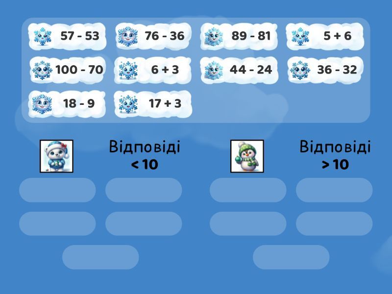 Відповіді < 10: 36 - 32, 89 - 81, 18 - 9, 57 - 53, 6 + 3, Відповіді > 10: 17 + 3, 5 + 6, 76 - 36, 44 - 24, 100 - 70,