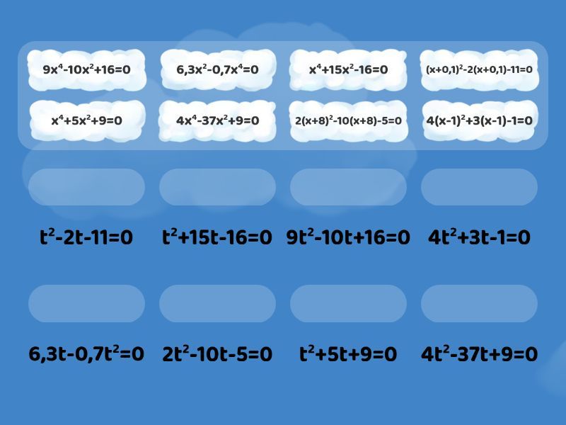 4x4-37x2+9=0 - 4t2-37t+9=0, x4+5x2+9=0 - t2+5t+9=0, 6,3x2-0,7x4=0 - 6,3t-0,7t2=0, 9x4-10x2+16=0 - 9t2-10t+16=0, x4+15x2-16=0 - t2+15t-16=0, 4(x-1)2+3(x-1)-1=0 - 4t2+3t-1=0, 2(x+8)2-10(x+8)-5=0 - 2t2-10t-5=0, (x+0,1)2-2(x+0,1)-11=0 - t2-2t-11=0,