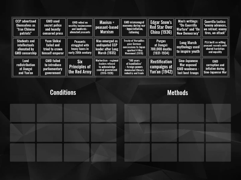 Conditions: GMD corruption and inflation during Sino-Japanese War, Peasants struggled with heavy taxes in early 20th century, Warlordism - regional leaders refused to acknowledge central government (1916-1928), "100 years of humiliation" - foreign powers dominated China's industry and trade, GMD failed to introduce parliamentary government, Sino-Japanese War exposed GMD weakness - lost best troops, GMD relied on wealthy businessmen and landlords - alienated peasants, GMD used secret police and heavily censored press, Treaty of Versailles gave German concessions to Japan - sparked 4 May Movement (1919), GMD mismanaged economy during war - hyperinflation, rationing, Yuan Shikai failed and tried to crown himself emperor, Students and intellectuals alienated by GMD censorship, Methods: Six Principles of the Red Army, Land redistribution at Jiangxi and Yan'an, Mao's writings: "On Guerrilla Warfare" and "On New Democracy", Guerrilla tactics: "enemy advances, we retreat; enemy tires, we attack", Long March mythology used to inspire youth, Mao emerged as undisputed CCP leader after Long March (1935), Purges at Jiangxi: 700,000 deaths (1931-1934), CCP advertised themselves as "true Chinese patriots", PLA built on willing peasant recruits with shared hardships and equality, Maoism = peasant-based Marxism, Edgar Snow's Red Star Over China (1936), Rectification campaigns at Yan'an (1942),