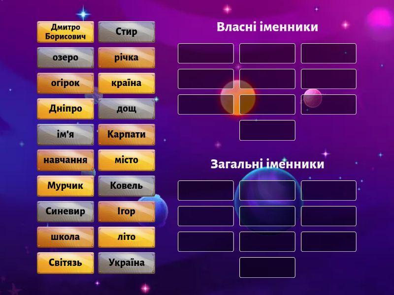 Власні іменники: Синевир, Ігор, Світязь, Карпати, Україна, Ковель, Стир, Мурчик, Дмитро Борисович, Дніпро, Загальні іменники: ім'я, школа, дощ, літо, навчання, огірок, місто, озеро, річка, країна,