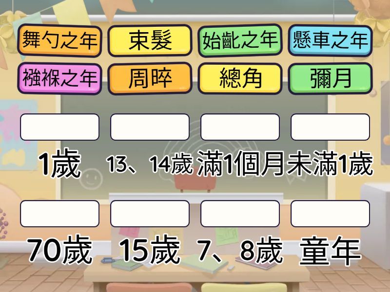 彌月 - 滿1個月, 襁褓之年 - 未滿1歲, 周晬 - 1歲, 始齔之年 - 7、8歲, 總角 - 童年, 舞勺之年 - 13、14歲, 束髮 - 15歲, 懸車之年 - 70歲,