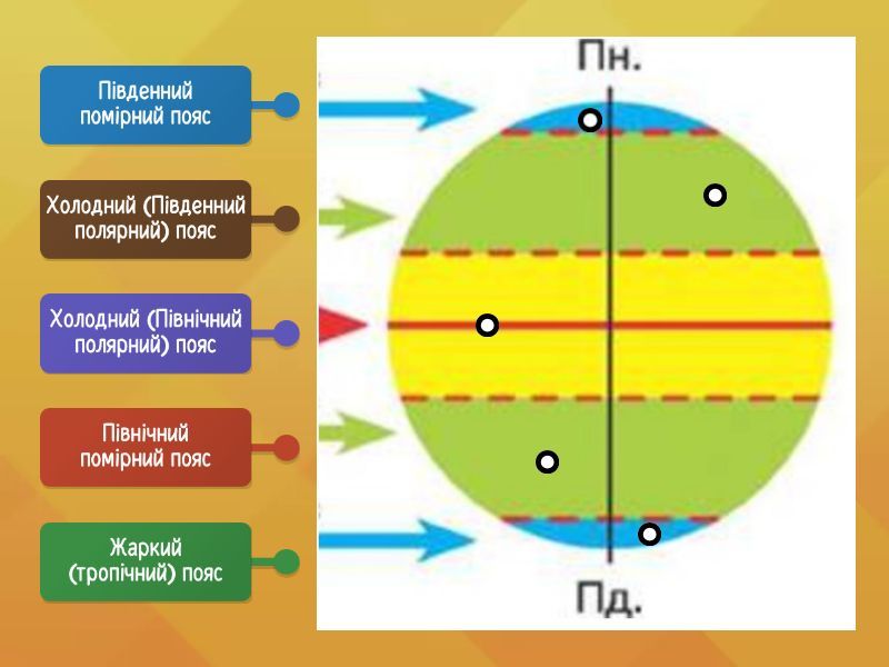 Жаркий (тропічний) пояс, Холодний (Північний полярний) пояс, Північний помірний пояс, Південний помірний пояс, Холодний (Південний полярний) пояс.