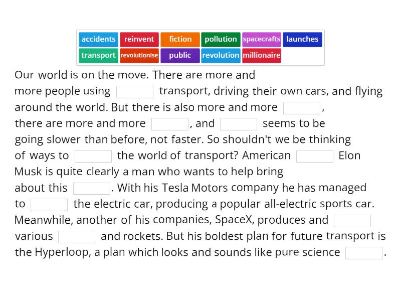 Our world is on the move. There are more and more people using ____ transport, driving their own cars, and flying around the world. But there is also more and more ____, there are more and more ____, and ____ seems to be going slower than before, not faster. So shouldn't we be thinking of ways to ____ the world of transport? American ____ Elon Musk is quite clearly a man who wants to help bring about this ____. With his Tesla Motors company he has managed to ____ the electric car, producing a popular all-electric sports car. Meanwhile, another of his companies, SpaceX, produces and ____ various ____ and rockets. But his boldest plan for future transport is the Hyperloop, a plan which looks and sounds like pure science ____. If everything goes ____ to plan, the Hyperloop will be a ____ of long tubes set on top of ____ which will run next to ____. Inside the tubes people will travel inside ____: about six passengers plus their luggage per capsule. The capsules will create a ____ of air underneath them. With no ____, Musk believes they will be able to travel at ____ of up to 1,220kph, nearly the speed of sound! It will take just half an hour to travel from Los Angeles to San Francisco. ____ the journey takes seven hours. The ____ of the Hyperloop is that it is much faster than a high-speed train, and, unlike planes, there will be no time ____ in taking off and landing. Nevertheless, for journeys over 1,600 kilometres, Eton Musk believes that ____ air travel will be ____. In the last 50 years, there has been a sharp ____ in the number of people travelling by air. All the ____ suggests that this trend is going to continue. With this in mind, the company Airbus has already made plans for how they are going to make flying more ____. The engineers at Airbus think that in 2050, with new ____ techniques and ____, planes will have ____ sections allowing you ____ views from your seat. Seats will change size and shape to give you a more comfortable flight. And ____ will be able to choose between different zones in the plane such as an Interactive zone, where you'll be able to meet people and play electronic games, and a Relaxation zone, where special ____ will give you a massage! For shorter journeys, ____ predict that cars will probably ____ the most common ____ of transport. Of course, soon the ____ car will be the norm, hopefully limiting the number of road ____. But it probably won't be too long before we start seeing flying cars in our skies. Indeed, one of the biggest changes in the future will be the number of ____ in the sky. Soon, when you look up, you'll see hundreds of ____ carrying everything from pizzas to heavy ____. A group of experts is meeting again next month to talk about the ____ of drones on air traffic. But imagine when cars take to the skies, too. A major challenge will be how to produce flying cars that do not create terrible air and noise ____, or serious ____. Talking of accidents, it is often said that the safest form of transport is ____. Maybe that's one of the reasons why Japanese ____ are drawing up plans to put ____ into space using a massive elevator that will travel more than 35,000 kilometres into ____. Thirty passengers and their small ____ will spend a week travelling a quarter of the way to the Moon at speeds of up to 190kph. At the end of the ____, they'll reach a ____ station where they'll be able to get an ____ view of the Earth, with little or no training ____. The only problems at the moment are the cost of the elevator's ____ (roughly ____ at $6 billion), and the fact that it could take 40 years to build!