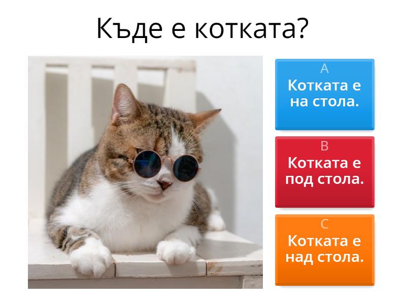 1) Къде е котката? a) Котката е на стола. b) Котката е под стола. c) Котката е над стола. 2) Къде е кучето? a) Кучето е на къщата. b) Кучето е в къщата. c) Кучето е до къщата. 3) Къде е детето? a) Детето е на леглото. b) Детето е до леглото. c) Детето е под леглото. 4) Къде са децата? a) Децата са на дървото. b) Децата са в дървото. c) Децата са пред дървото. 5) Къде е момичето? a) Момичето е пред дървото. b) Момичето е зад дървото. c) Момичето е на дървото. 6) Къде е жената? a) Жената е зад къщата. b) Жената е в къщата. c) Жената е пред къщата. 7) Къде е мъжът? a) Той е в колата. b) Той е до колата. c) Той е пред колата. 8) Къде е телефонът? a) Телефонът е на масата. b) Телефонът е в масата. c) Телефонът е до масата. 9) Къде е ябълката? a) Ябълката е до книгата. b) Ябълката е под книгата. c) Ябълката е пред книгата. 10) Къде е самолетът? a) Самолетът е до планината. b) Самолетът е пред планината. c) Самолетът е над планината.