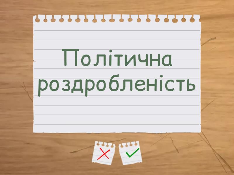 Археологія - Наука, що вивчає первісні, стародавні та середньовічні матеріальні (викопні)пам'ятки - стоянки, поселення, поховання тощо., Археологічна культура - Сукупність археологічних пам'яток певної території і часу, що мають місцеві своєрідні особливості. , Історія - Наука, що вивчає минуле людства на основі речових (матеріальних), усних та писемних джерел., Хронологія - 1) Послідовність подій у часі. 2) Наука про історичний час, способи літочислення тощо., Історичні джерела - Сліди життєдіяльності людини в минулому (знаряддя праці, зразки культу та мистецтва, усні та писемні пам'ятки - загалом, ВСЕ, що може дати інформацію про життя людей в минулому), Палеоліт - Давній кам'яний вік (1 млн. р. тому - 11 тис. р. до н.е.), Мезоліт - Середній кам'яний вік (11 - 6 тис. р. до н.е.), Неоліт - Новий кам'яний вік (6 - 4 тис. р. до н.е.), Енеоліт - Мідно-кам'яний вік (4 - 3 тис. р. до н.е.), Неолітична революція - Перехід від привласнювальних до відтворювальних форм господарювання, Привласнювальне господарство - Форма господарювання, за якої людина споживала готові продукти природи (до П.Г відносяться: збиральництво, полювання, рибальство)., Відтворювальне господарство - Спосіб життя та форма господарювання, які ґрунтуються на землеробстві, скотарстві та ремеслах. У цьому випадку люди вже споживають продукти, створені власне ними: вирощене зерно і худобу, виготовлений посуд, тканину тощо., Колонізація - Залелення, господарське освоєння нових земель., Кочовики - Народи/племена, які не мають постійного місця проживання та постійно пересуваються (як правило, слідуючи за отарами/табунами своєї худоби) , Курган - Штучний пагорб, ствлорений на місці кочівницького поховання., Тотемізм - Одна з первісних форм релігійних вірувань, для якої характерна віра в спільне походження й кровну спорідненість між даною групою людей (родом) і певним видом тварин, рослин, рідше тим чи іншим предметом або явищем природи., Анімізм - Віра в те, що предмети, природні явища, тварини, навіть предмети наділені душею., Магія - Система обрядів та ритуалів, нібито здатних впливати на хід подій, людей, явища природи тощо., Політеїзм - Багатобожжя (релігії Давньої Греції, Риму, Єгипту, давніх слов'ян), Монотеїзм - Єдинобожжя (християнство, іслам, юдаїзм), Капище - Місце здійснення релігійних обрядів у давніх слов'ян., Волхви - Служителі релігійного культу у давніх слов'ян (жерці)., Племінний союз - Територіальне й військово-політичне об'єднання кількох сусідніх племен, Князь - 1) Голова племені чи племінного союзу; 2) в IX—XVI ст. у слов'ян та деяких інших народів голова феодальної монархічної держави або окремого політичного об'єднання (удільний князь);, Шлюбна дипломатія - Укладання вигідних союзів, встановлення дипломатичних відносин шляхом шлюбів із членами родин правителів різних країн., Полюддя - Фосма (спосіб) збирання данини у вигляді натурального оброку з підлеглого населення в Київській Русі, що його провадив кожної осені київський князь або його намісник., Язичництво - Дохристиянські вірування в багатьох богів, які, зазвичай, уособлювали сили природи., Політична роздробленість - Такий стан держави, що характеризується децентралізацією влади, коли вона розділена на кілька незалежних одне від одного князівств (земель), Віче - Загальні збори громадян міст Київської Русі для розгляду громадських справ., Вотчина (во