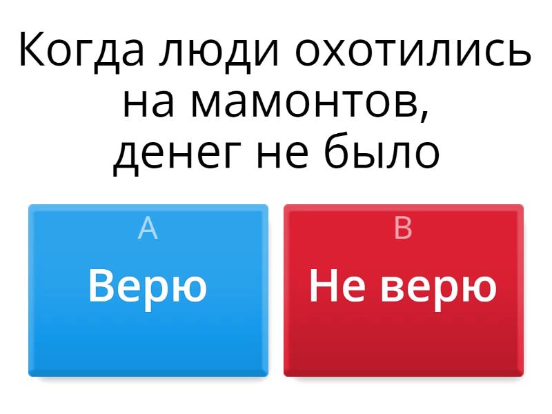 1) Когда люди охотились на мамонтов, денег не было a) Верю b) Не верю 2) Товар – это обмен игрушками. a) Верю b) Не верю 3) Деньги – это товар, которым удобно обмениваться a) Верю b) Не верю 4) Бартер – это деньги другой страны a) Верю b) Не верю 5) Монеты – это бумажные деньги a) Верю b) Не верю