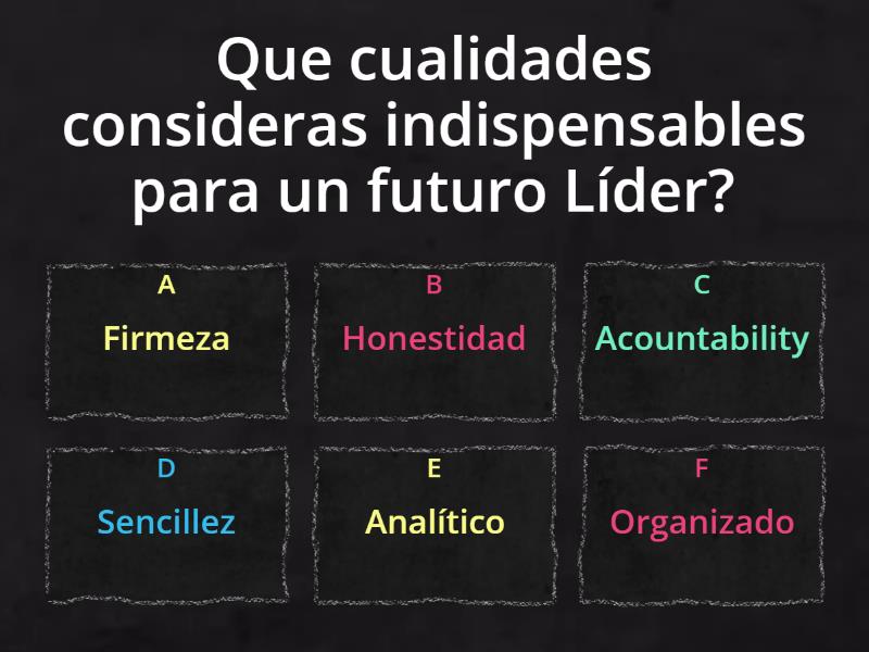 1) Quien de estas personas consideras un lider? a) 1 b) 2 c) 3 d) 2) Cuales de esta opciones son considerados como estilos de Liderazgo? a) Autoritario b) Democratico c) Formativo d) Liberal e) Orientado a la tarea f) Estratégico 3) Que cualidades consideras indispensables para un futuro Líder? a) Firmeza b) Honestidad c) Acountability d) Sencillez e) Analítico f) Organizado 4) Todo jefe puede ser un Líder? a) si b) no 5) Como definirías Acountability? a) No hay definición literal b) Se traduce como Responsabilidad c) Es una combinación entre responsabilidad, acción y coherencia