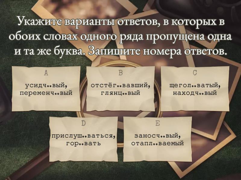 1) Укажите варианты ответов, в которых в обоих словах одного ряда пропущена одна и та же буква. Запишите номера ответов. a) усидч..вый, переменч..вый b) отстёг..вавший, глянц..вый c) щегол..ватый, находч..вый d) прислуш..ваться, гор..вать e) заносч..вый, отапл..ваемый 2) Укажите варианты ответов, в которых в обоих словах одного ряда пропущена одна и та же буква. Запишите номера ответов. a) неразборч..вый, овлад..вать b) высме..вающий, отапл..вать c) заботл..вый, заманч..вый d) запечатл..вать, милост..вый e) завистл..вый, коч..вать 3) Укажите варианты ответов, в которых в обоих словах одного ряда пропущена одна и та же буква. Запишите номера ответов. a) претерп..вающий, замш..вый b) каракул..вый, остр..нький c) леле..вший, извил..на d) милост..вый, измуч..нный e) разбрызг..вая, тюл..вый