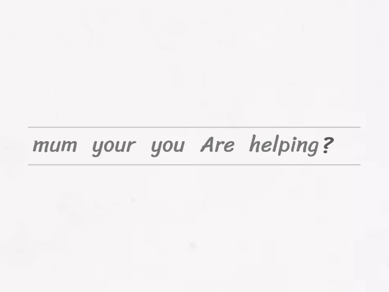 Are you helping your mum?, Is your sister doing arts and crafts now?, Is Ann talking to her friend now?, Are they walking the dog now?, Is he doing the washing-up?, Is Mike climbing the wall?, Is mum cleaning the bath now?, Are they making the bed?,
