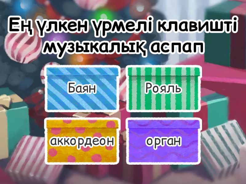 1) Ең үлкен үрмелі клавишті музыкалық аспап a) Баян b) Рояль c) аккордеон d) орган 2) Испан ақсүйек қауымының поэтикалық-лирикалық әні. a) вальс b) романс c) частушкалар d) рок 3) 11 буынды өлең a) көк b) қара c) ақ d) жасыл 4) Ағылшын тілінен тербел,сырғана деп аударылатын музыка стилі a) Рок-н- ролл b) стэп c) Джаз d) Свинг 5) Қазақ вальсының падишасы? a) Ш.Қалдаяқов b) Н.Тілендиев c) Е.Хасанғалиев d) Ә.Бейсеуов 6) Музыкалық-драмалық шығармалардың сөз мәтіні немесе қысқаша мазмұны. a) Остинато b) Антракт c) Либретто d) Лейтмотив 7) "Балапан қаз" әнінің авторы a) Біржан сал b) Ақан сері c) Халық әні d) Мәди 8) Музыкадағы дыбыс күштерін азайту немесе күшейту a) Динамика b) Вариация c) Хор d) Экспромт 9) Опера басталар алдында орындалатын оркестрге арналған кіріспе. a) Балет b) Увертюра c) Речитатив d) Ария 10) Күй тартудың неше түрі бар? a) 2 b) 1 c) 3 d) 4 11) Еркін жазылатын шағын шығарма. a) Экспромт b) Мадригал c) Симфония d) Балет 12) Көп дауысты вокалдық музыка a) Хор b) Сюита c) Сопрано d) Альт 13) Француз тілінде қатар, жүйелілік дегенді білдіретін бірнеше бөлімді шығарма a) Сюита b) Ария c) Дуэт d) Кантата 14) "Тәжік биі" фортепианоға арналған шығарманың авторы a) Ә.Бейсеуов b) Ш.Қалдаяқов c) Л.Хамиди d) Ахмет Жұбанов