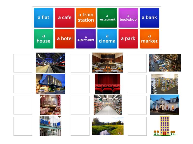 a train station, a hotel, a cafe, a bank , a restaurant, a cinema, a supermarket, a park, a market, a bookshop, a house, a flat,