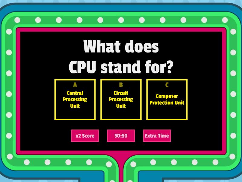 1) What does CPU stand for? a) Central Processing Unit b) Circuit  Processing Unit c) Computer Protection Unit 2) What is 9 represented in binary? a) 1001 b) 1010 c) 0101 d) 010010 3) What are the 4 parts of a computer ? a) Input, Orange, Storage, Processing b) None of the above c) Input, Output, Storage, Processing d) All of the above 4) What are (ALL) of the examples of computer hardware ? a) Circuit b) Wire c) Chip d) Speaker e) All Of The Above 5) What is the CPU? a) The speaker b) The Masterchip c) The wireing 6) What numbers are used in the binary system? a) 0 And 9 b) 1, 2, 3, 4, 5, 6, 7, 8, And 9 c) None Of The Above d) 0 And 1 7) Which of these is considered a computer ? a) b) c) d) 8) How many digits are there is the binary system? a) 10 b) 9 c) 1 d) 0 e) 100 9) Why are smaller computers faster? a) It's easier to hold in your hand b) It Has More Space To Travel c) They Have Less Space To Travel 10) How many calculations per second can circuits perform? a) One b) Billions c) One Hundred d) One Million 11) Text, images, and sound can (not) be represented by binary numbers. a) True b) False 12) Computers are programed. a) True b) False 13) What is the operating system of a computer a) It Manages How Software Gets To Use The Hardware Of The Computer b) It Makes The Computer Charge c) It Would Make The computer Hotter And Colder 14) Which of these is a computer chip a) b) c) 15) How much technology do computers have? a) None b) A Lot c) A Little Bit