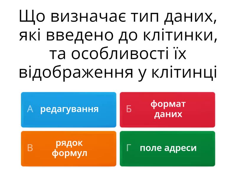 1) Структурована сукупність даних, розміщених по рядках і стовпцях a) презентація b) таблиця c) проєкт d) схема 2) Комп'ютерний варіант звичайної таблиці a) електронна таблиця b) презентація c) малюнок d) проект 3) Прикладна програма, яка призначена для опрацювання даних, поданих в електронних таблицях a) текстовий процесор b) табличний процесор c) графічний редактор d) середовище виконання алгоритмів 4) Електронна таблиця, створена за допомогою табличного процесора Microsoft Excel, називається ... a) презентацією b) книгою c) проектом d) малюнком 5) Яке з наведених зображень є значком табличного процесора Excel? a) b) c) d) 6) Що визначає тип даних, які введено до клітинки, та особливості їх відображення у клітинці a) редагування b) формат даних c) рядок формул d) поле адреси 7) Зміна зовнішнього вигляду таблиці чи окремих її клітинок: шрифту, кольору, накреслення символів; вирівнювання; кольору заливки, розмірів і меж клітинок тощо a) редагування таблиці b) форматування таблиці c) створення таблиці d) аналіз таблиці 8) Яка адреса виділеної клітинки a) А2 b) Б3 c) В3 d) С5 9) За замовчуванням в клітинці застосовується формат даних.. a) текстовий b) числовий c) фінансовий d) загальний 10) Змінити формат даних можна.. a) на вкладці Основне b) на вкладці Дані c) на вкладці Розмітка сторінки d) на вкладці Формули 11) До редагування електронних таблиць відноситься: a) Реагування вмісту клітинок b) Вставка та видалення рядків, стовпців, клітинок, аркушів c) Зміна зовнішнього вигляду таблиці d) Зміна зовнішнього вигляду клітинки