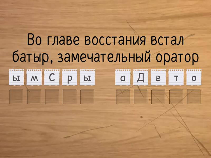 Сырым Датов - Во главе восстания встал батыр, замечательный оратор, Нуралы хан - хан младшего жуза во время восстания, стихийность - причина поражения восстания С.Датова, отсутствие четких планов восстания - причина поражения восстания С.Датова, правый берег реки Урал - запрещали кочевать , Хивинское ханство - государство куда откочевал С.Датов,