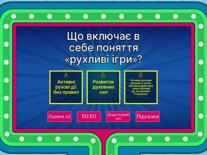 1) У спортивній залі можна знаходитися лише у … a) Спортивній формі та спортивному взутті b) Домашньому вбранні c) Вуличному вбранні 2) Особа, яка контролює виконання правил під час гри … a) Спостерігач b) Суддя c) Експерт зі спорту 3) Де зображена швидкість? a) b) c) 4) Що таке загартовування організму? a) Дуже тепло одягатись літом b) Здорова їжа c) Спеціальне тренування терморегуляторних процесів організму 5) Де зображена спритність? a) b) c) 6) Як ти вважаєш, чому треба дотримуватись дистанції під час бігу у колоні по одному? a) Дистанції не треба дотримуватись, для того щоб можна було один одного штовхати та бавитися! b) Для того, аби не травмуватися під час руху та кожному було достатньо місця д 7) Де зображена сила? a) b) c) 8) Як ти вважаєш, питний режим це важлива складова під час занять спортом? a) Так, тому що мій організм потребує більше вологи коли я займаюсь фізичними вправами. b) Ні, я вважаю що вода не особливо важлива під час занять фізичною культурою. 9) Де зображена гнучкіть? a) b) c) 10) Учні можуть займатись фізичною культурою коли: a) Їм дозволили батьки b) Пройшли медогляд c) Коли захотіли учні 11) На твою думку, важливо дотримуватися режиму дня, сну та відпочинку, правильно харчуватись та займатися спортом? a) Ні, я так не вважаю b) Не завжди c) Так, це важливо для здоров'я 12) Під час рухливих ігор, учень зобов'язаний: a) Порушувати правила гри b) Штовхатись c) Дотримуватись правил гри та безпеки 13) Що включає в себе поняття «рухливі ігри»? a) Активні рухові дії без правил b) Розвиток духовних сил c) Активна рухлива діяльність дітей, для якої характерні творчі рухливі дії, мотивовані її сюжетом 14) При заняттях фізичною культурою вдома повинно бути: a) Чисто, провітрено, зайві речі прибрані b) Брудно, жарко, зайві речі розкидані 15) Оберіть вислів, який найбільше підходить для здорового способу життя a) У кого що болить, той про те і гомонить b) У здоровому тілі, здоровий дух c) Добре діло - роби сміло