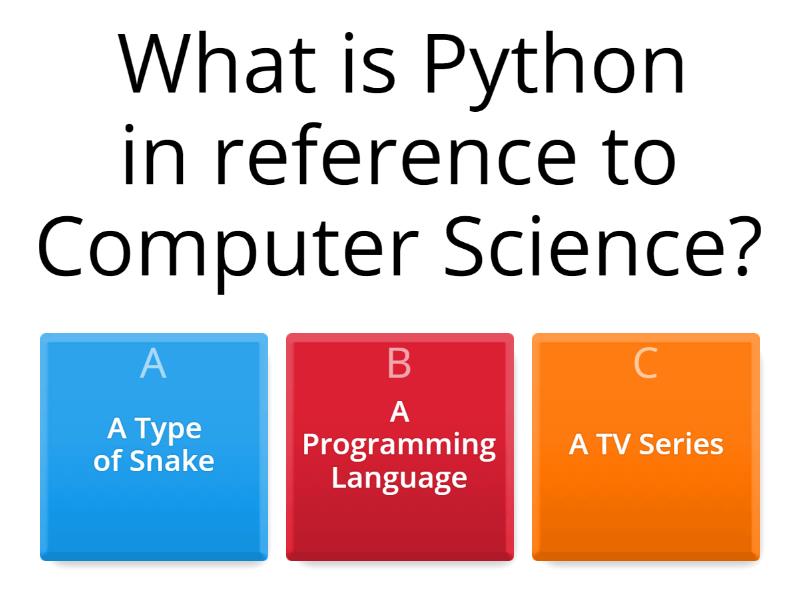 1) What is Python in reference to Computer Science? a) A Type of Snake b) A Programming Language c) A TV Series 2) When was Python Created? a) 1930 b) 1991 c) 2010 d) 2020 3) Who Created Python? a) Guido van Rossum b) NASA c) Petchey Computer Science Team 4) Guido van Rossum the creator of Python was Dutch, which country was he born in? a) Denmark b) Netherlands c) Holland d) England e) Switzerland 5) Where is Python used? a) Only in Schools b) In Large Companies c) In Small Companies d) Governments e) In lots of organisations 6) Why was Python Developed? a) To make an easy to read programming Language b) To make a programming language accessible to everyone without payment c) To encourage more people to learn coding d) All of the these e) To make an easy to learn programming Language. 7) Is Python the most used Programming Language in the World? a) Yes b) No 8) If you typed in print("Hello") in a Python Programmer what would the screen display? a) hello b) Hello c) print Hello d) print hello e) nothing 9) If you typed in   name = input("please type in your name") and print (name) what do you think the program will do? a) Ask for my name and then print my name b) show an error c) Nothing d) print name on the screen