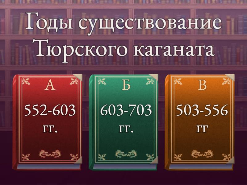 1) Годы существование Тюрского каганата a) 552-603 гг. b) 603-703 гг. c) 503-556 гг 2) Основатель Тюрского каганата a) Мукан каган b) Кара Еске c) Бумын каган 3) В каком году распался Тюрский каганат a) 603 г. b) 703 г. c) 503 г. 4) Что означает титул ЕЛХАН a) Всенародный хан b) наследник c) правитель 5) С кем воевали тюрки во главе Бумына a) печенеги b) жужаны c) найманы 6) Джабгу огузов a) Шахмалик b) печенек c) жабгу 7) Годы жизни Тюргешского каганта a) 704-756 гг. b) 756-785 гг. c) 754-756 гг. 8) Основатель Тюргешкого каганата a) Сулу b) Бумын c) Ушлик 9) Письменность тюрков  a) руны-древний тюрский язык b) петроглиф c) иероглиф 10) Годы жизни государство Огуз a) 9-середина 11 в. b) 10-11 век c) 12-13 век