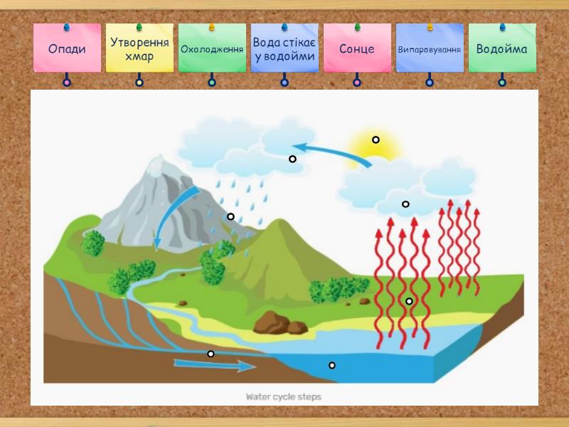 Водойма, Сонце, Випаровування, Утворення хмар, Охолодження, Опади, Вода стікає у водойми.