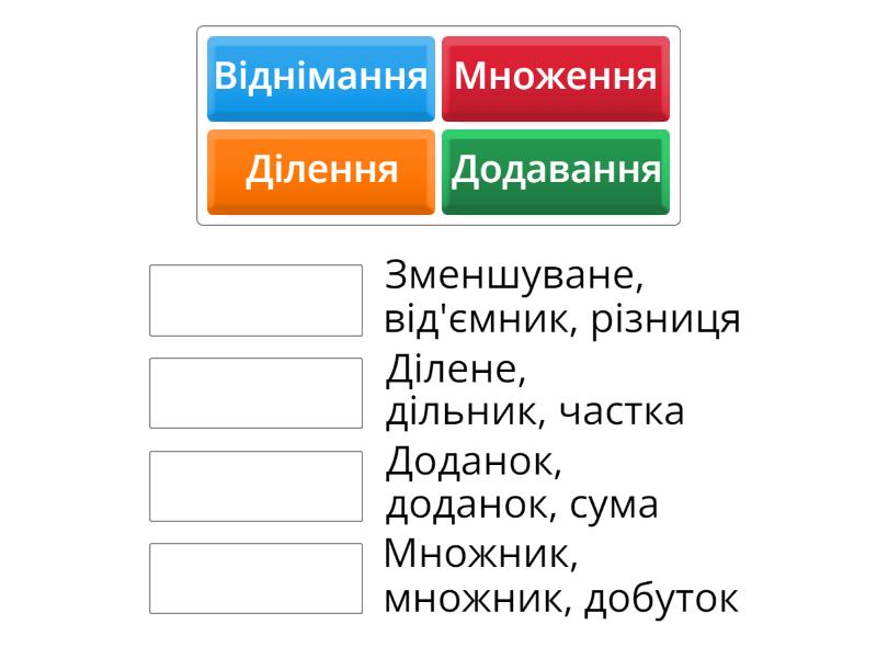 Додавання - Доданок, доданок, сума, Віднімання - Зменшуване, від'ємник, різниця, Множення - Множник, множник, добуток, Ділення - Ділене, дільник, частка,
