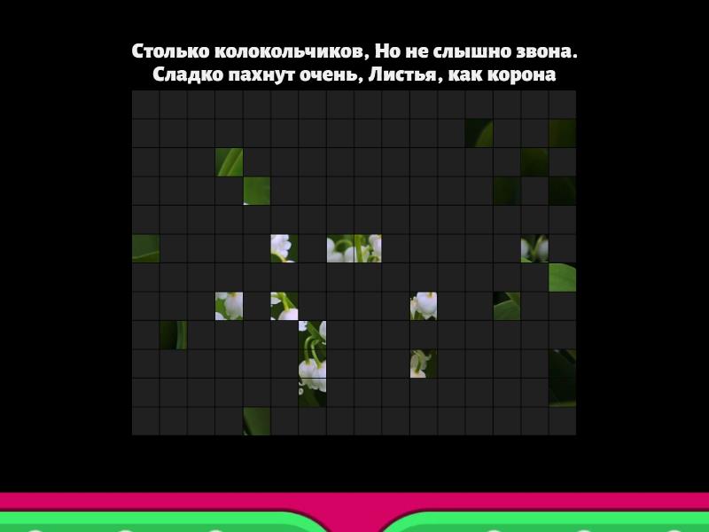 1) Столько колокольчиков,  Но не слышно звона. Сладко пахнут очень, Листья, как корона a) Ландыш b) мак c) василек 2) Стало хмуро за окном, Дождик просится к нам в дом. В доме сухо, а снаружи Появились всюду… a) капля b) снежинка c) лужа 3) Ем столовой суп в обед, Чайной пробую десерт, Дайте мне ещё немножко, Где моя большая… a) лодка b) ложка c) кошка 4) Огород она вскопала, Но ни капли не устала. a) ложка b) глабли c) лопата 5) Карандашик на листе Нарисует свет и тень, А пройдется друг его – И не будет ничего. a) фломастер b) кисточка c) ластик 6) Она под крышами живет, Гнездо своё из глины вьет, Целый день суетится, На землю не садится, Высоко в облаках летает, Мошек на лету поедает, В черном фраке лапочка, А зовется ?…. a) дятел b) галка c) ласточка