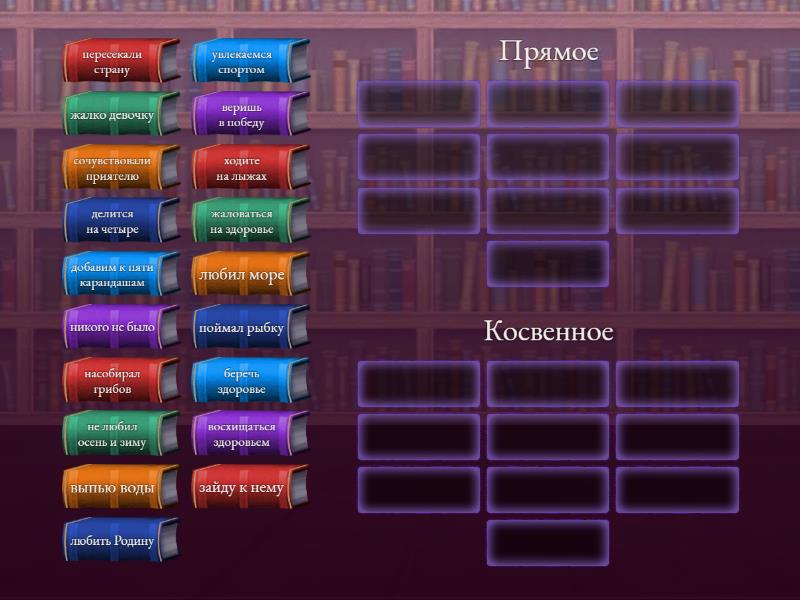 Прямое: поймал рыбку, любить Родину, беречь здоровье, жалко девочку, выпью воды, насобирал грибов, никого не было, любил море, пересекали страну, не любил осень и зиму, Косвенное: жаловаться на здоровье, восхищаться здоровьем, увлекаемся спортом, веришь в победу, ходите на лыжах, сочувствовали приятелю, зайду к нему, делится на четыре, добавим к пяти карандашам,